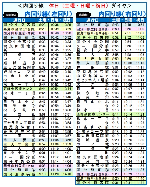 平日運行ダイヤ(JPG:475KB)と土日祝日運行ダイヤ(JPG:240KB)とあります。市役所周辺から隼人見次、鹿兒島神宮、隼人日当山地区、医師会医療センター、隼人姫城地区、国分新町地区などを通って市役所周辺に戻ります。